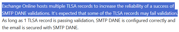 The errors you see on TLSA record are EXPECTED – see here in the MSFT article: